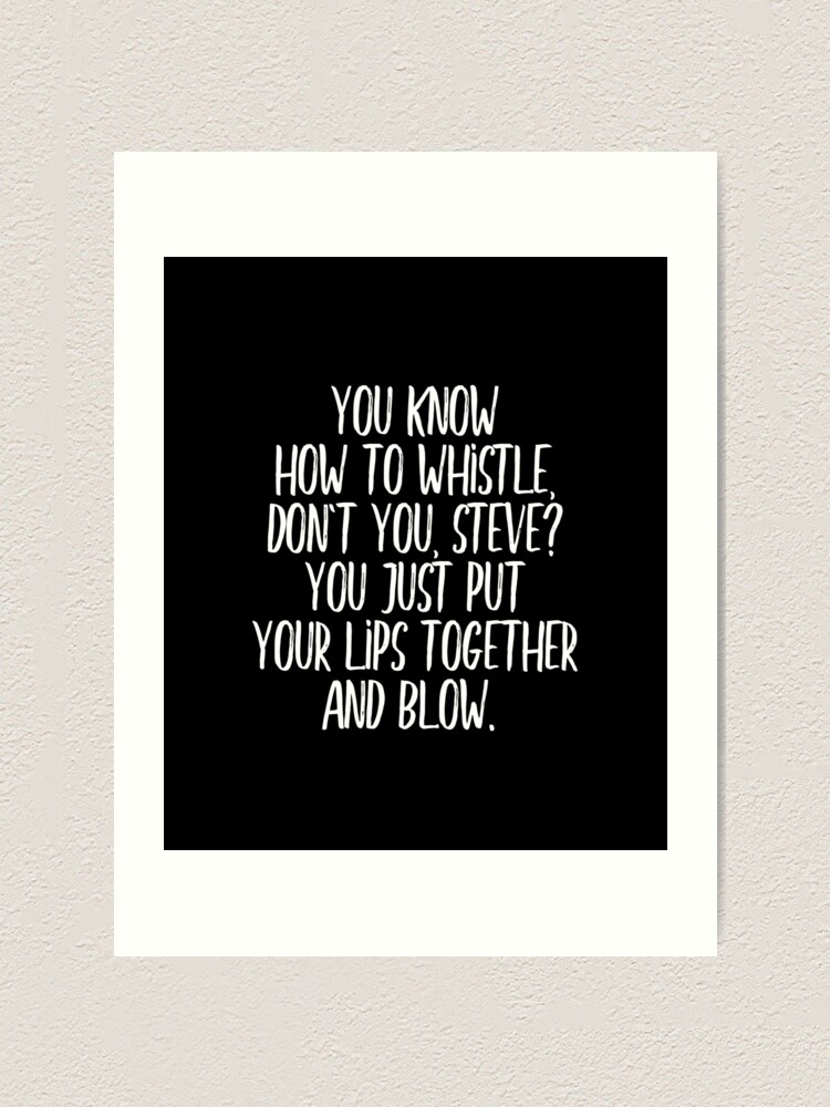 Which Film Starring Lauren Bacall Is The Following Line From You Do Know How To Whistle Don T You Steve You Just Put Your Lips Together And Blow The Lauren Bacall Trivia from images6.fanpop.com You know how to whistle, don't you, steve? Keep in mind that each should last roughly three seconds as this is the universally recognized duration. ― lauren bacall, the complete films of humphrey bogart. Wet your lips and tuck your lips inward over your teeth (as if you're a baby whose teeth haven't come in yet). Feb 22, 2017 · to whistle with your fingers: Hold the whistle to your mouth and blow three loud but short blasts. How can i learn to whistle? "you know how to whistle, don't you steve?